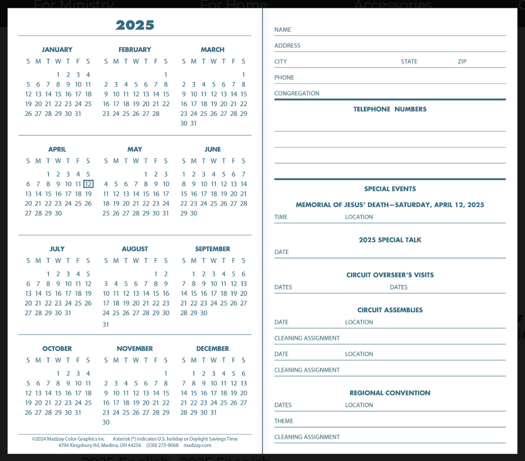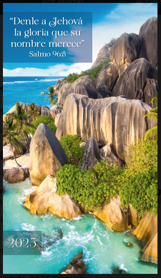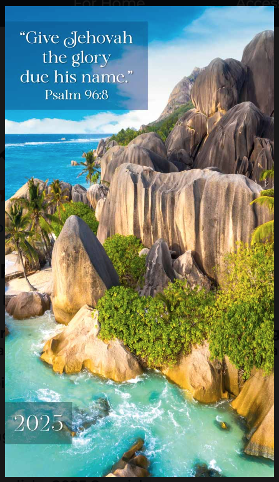 2025 pocket calendar, planner, journal with space for notes, goals, daily Bible reading and pioneer activity pages! An attractive, full-color annual calendar and planner featuring the 2025 year text with an ocean scene from Seychelles on the front and back cover.