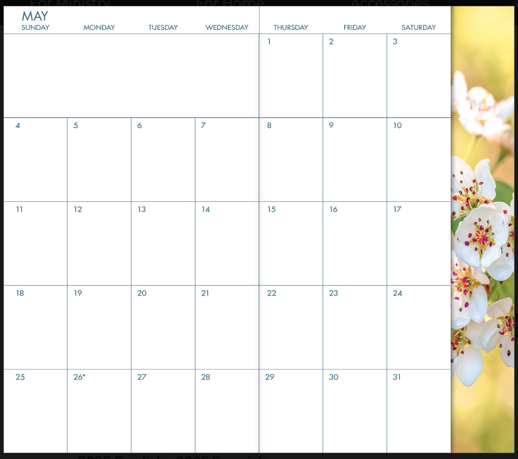 A great way to keep organized, be creative and acheive goals in an easy-to-carry calendar, planner, journal. Convenient spaces are also included for recording annual special events as well as year-at-a-glance calendars. Each calendar month has a seasonal photo that matches the corresponding month on our wall calendar. A clear vinyl cover is provided with each purchase to accommodate the calendar and, if purchased separately, our removable address book.