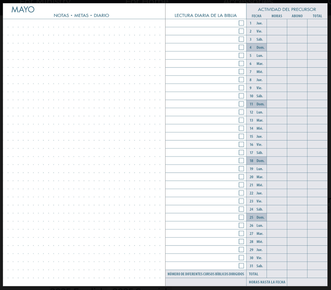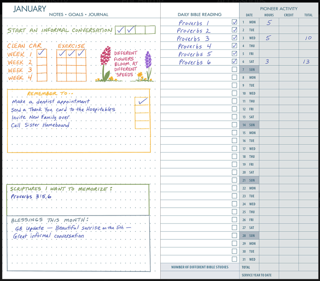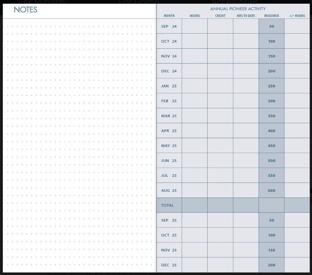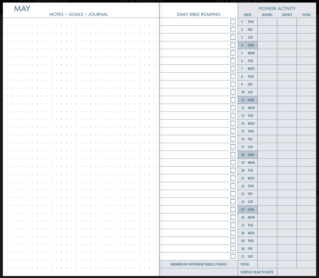 Following each calendar page are two pages for dot grid journaling to keep your handwriting neat while also being creative. A convenient chart for keeping track of annual service year activity is included in the back. It's a great versatile tool for creating boxes and bullet points for goals and notes that are important to you. On the right page, there is space to record your daily Bible reading along with check boxes. There is also a convenient chart for auxillary or regular pioneer activity which includes spaces for the number of Bible studies conducted that month, ministry and credit hours and year-to-date totals.
