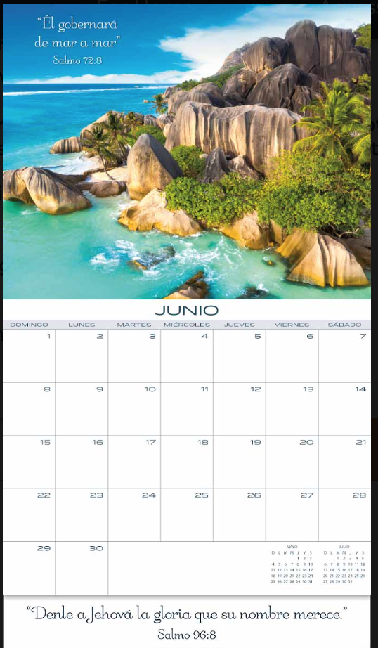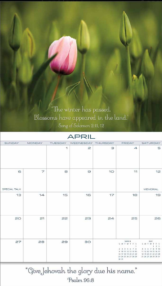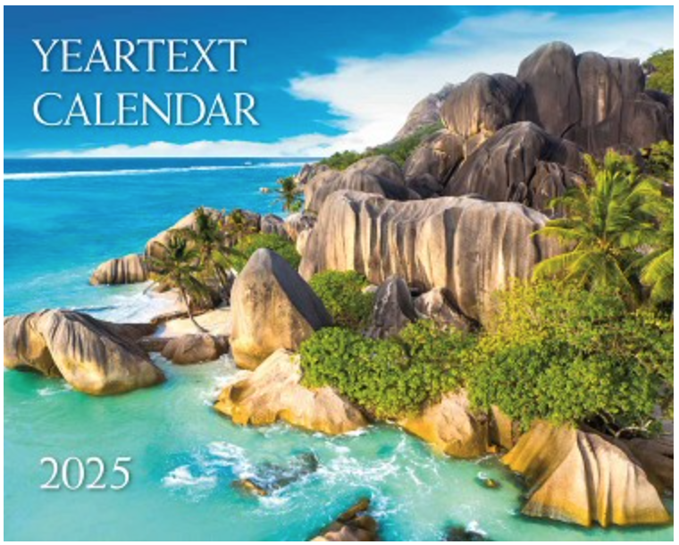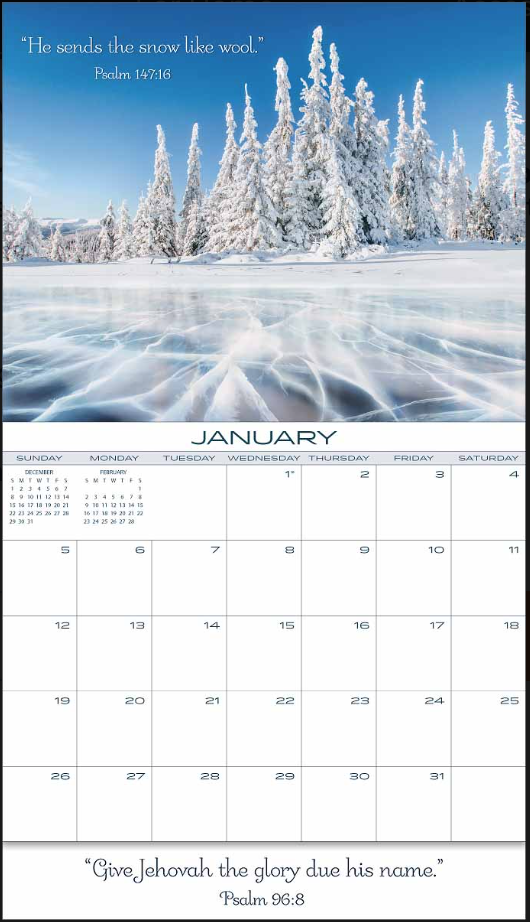 An attractive, full-color wall calendar featuring seasonal scenes for each month. (part of each month's scene is also used for the same month in our pocket calendar) New Feature: Each scene also contains a beautiful coordinating scriptural quote. Photos measure 8" x 10" for easy framing later. Large date boxes provide plenty of room for recording personal or family events. The 2025 year text is displayed by unfolding the flap on the back cover. Printed on high-quality 100# stock offering beautiful color reproduction and year-long durability.