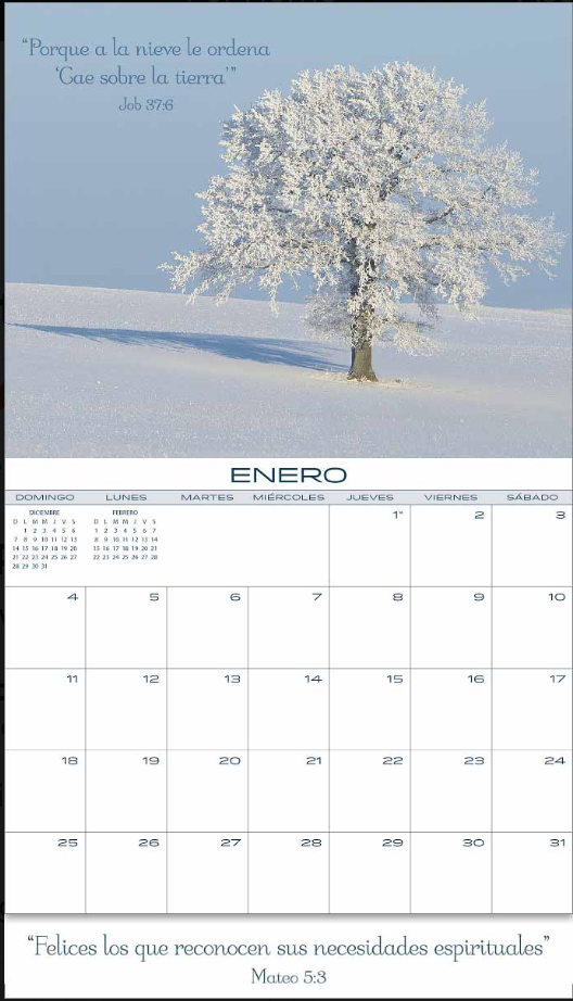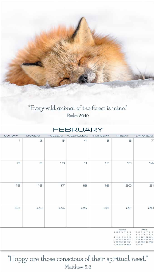 An attractive, full-color wall calendar featuring seasonal scenes for each month. Each scene contains a beautiful coordinating scriptural quote. Now with new uncoated calendar pages for easier writing! Photos measure 8" x 10" if you'd like to frame a favorite picture or verse later! Large date boxes provide plenty of room for recording personal or family events. The 2026 year text is displayed by unfolding the flap on the back cover. Printed on high-quality 100# stock offering beautiful color reproduction and year-long durability.