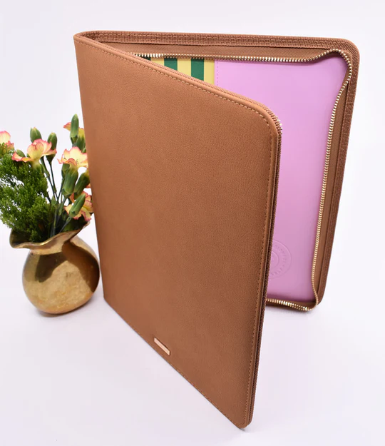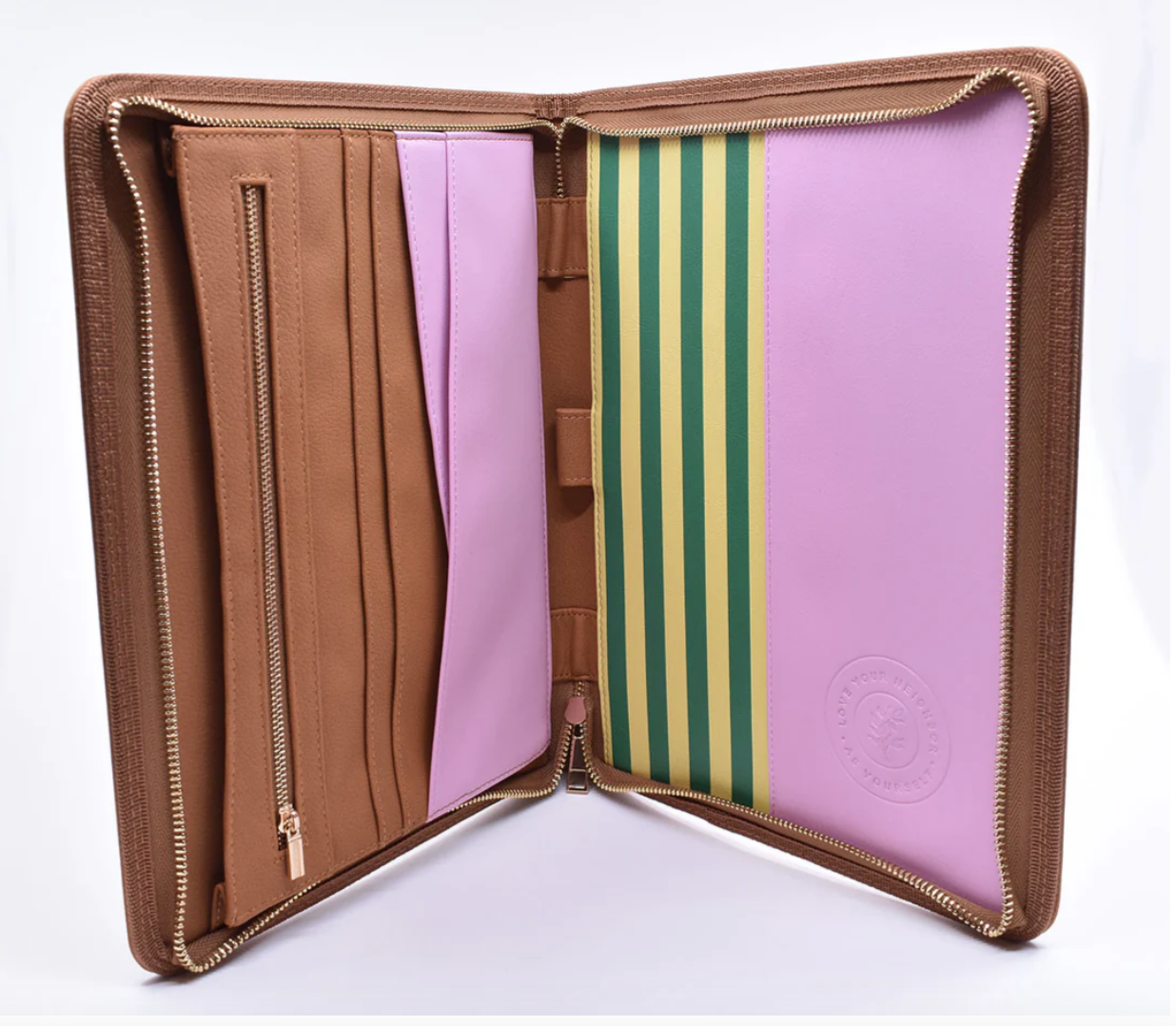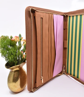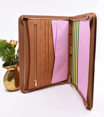 This organizer is made of buttery soft vegan leather with natural shades on the outside and gorgeous pops of color on the inside. It is perfect for every form of the ministry - door to door, public, letter writing and phone witnessing. They are custom sized for our literature. It easily holds tracts in the tall pockets, magazines and territories in the large pockets, contact cards and invites in the short pockets and stamps, pens, and stationery in the zipper pockets. We added a thin tall pocket on the right for your tablet. A tablet can slide in easily and stays in with a firm hold. It holds most sizes but not all, up to 9.7" is a good fit.